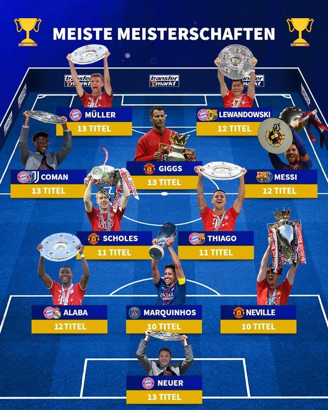 五大联赛夺冠次数最多11人阵容:梅西领衔,穆勒、吉格斯在列